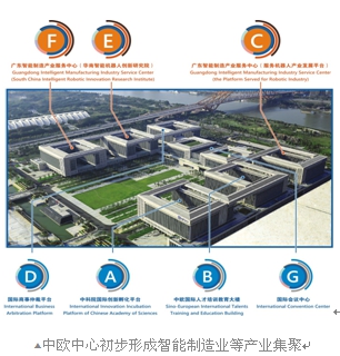 2016年7月25日,中共佛山市委十一届八次全会召开,佛山市委书记鲁毅表示,要紧扣创新驱动的核心因素,加快建设中国制造业一线城市,打造国家制造业创新中心,实现佛山全面腾飞。中欧中心作为北部片区乃至顺德重要的新兴产业发展载体,致力于把欧洲的先进科技、信息、人才与华南地区的资本、市场相对接,将打造智能制造产业服务中心及智能制造业作为发展重点之一,其C、E、F栋定位为广东智能制造产业服务中心,是集机器人及相关产品的研发、销售、检测、培训、展示于一体的产业服务基地、广东省智能制造企业对标“中国制造2025”及“德国工业4.0”的重要服务窗口。