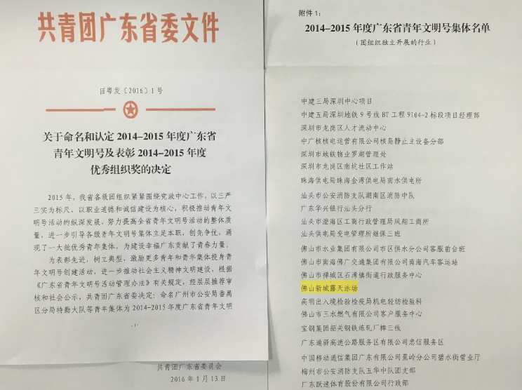 2015年10月23日,佛山市新城物业发展有限公司露天泳场项目参加了2014-2015年度广东省青年文明号评选会。来自广州、深圳、佛山、中山、湛江等21个地市(区)近200家集体展开了精彩激烈的角逐。佛山新城露天泳场项目过五关斩六将,在评选中脱颖而出,正式被命名和认定为广东省青年文明号。