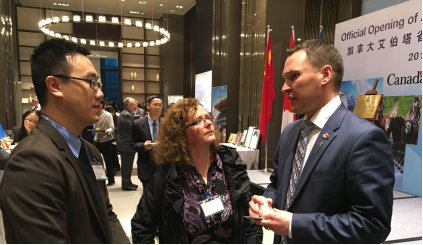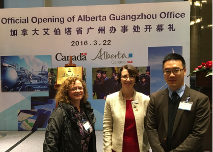 图2 加拿大艾伯塔省经济发展与贸易部部长(右)与国际创新转化生物产业孵化中心相关负责人进行洽谈 3月22日,国际创新转化生物产业孵化中心运营单位——广东中佛恒康投资管理有限公司受加拿大驻广州领事馆邀请,参加艾伯塔省驻广州办事处开幕典礼。广东省商务厅党组成员、副厅长陈越华,加拿大驻广州领事馆总领事白静芳女士,加拿大艾伯塔省经济发展与贸易部部长出席了本次开幕典礼。 开幕式上,白静芳总领事与国际创新转化生物产业孵化中心相关负责人进行了友好洽谈,表示加拿大政府非常支持中加两国在生物医药领域开展合作,并希望能帮助国际创新转化生物产业孵化中心继续推进在加拿大的各项商务合作。艾伯塔省经济发展与贸易部部长表示,艾伯塔省将出台一系列政策鼓励生物医药领域的科技创新和国际合作,希望国际创新转化生物产业孵化中心继续关注艾伯塔省的生物医药项目,谋求更深入的合作。(通讯员:陈昀云)