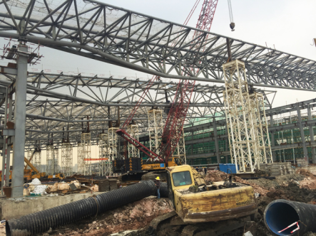 胡勇前介绍,目前项目进展较为顺利。1至5号展馆预应力管桩、管沟、底板等土建工程已基本完成,其中1号馆钢结构主桁架已施工完成,正在进行屋面、机电及幕墙施工;2号馆、3号馆正在进行钢柱吊装及主桁架吊装施工,现场正在同步开展幕墙及机电安装施工的前期准备工作;4号馆、5号馆钢柱吊装及主桁架施工已完成,正在进行屋面、机电及幕墙施工;能源中心土建工程已基本完成,正在进行机电安装及幕墙施工;综合管沟已基本完成,目前正在进行机电安装工作。
