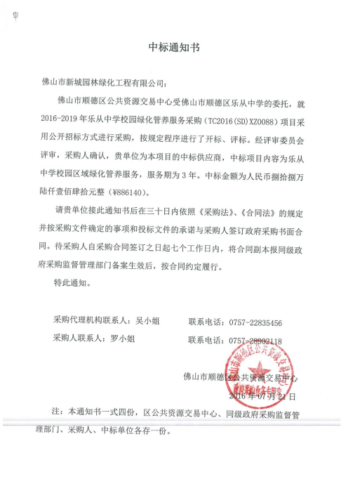 7月21日经在顺德区公共资源交易中心公开招标评选,我司在7家园林企业(其中园林绿化一级资质3家)的激烈竞标中脱颖而出,以造价¥88.6万元成功中标2016-2019年乐从中学校园绿化管养服务项目。今年是公司业务转型升级之年,也是经营发展的关键之年。我司凭借自身丰富的管养经验、技术过硬的团队、优质精细的管养服务,首次参与市场化竞标并成功中标,在公司外拓业务进程中迈出了坚实的一步,也标志着市场对于我司的专业技术和综合实力的认可。