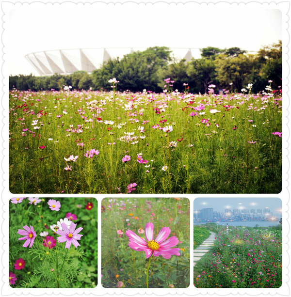 波斯菊又名秋英、格桑花、张大人花,为菊科一年生草本花卉。叶形雅致,花色丰富,适于布置花镜,在湿地公园汀步旁成片栽植美化绿化,颇有野趣。