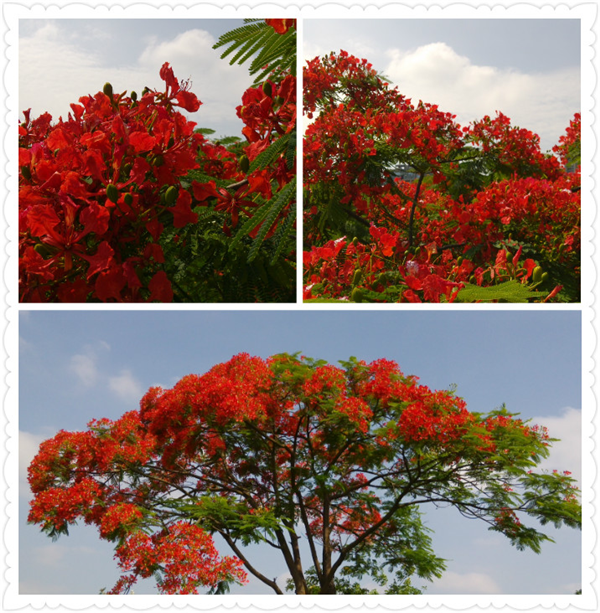 凤凰木取名于“叶如飞凰之羽,花若丹凤之冠”,又名红花楹树,为苏木科凤凰木属落叶乔木,原产非洲马达加斯加,为热带树种,喜高温多湿和阳光充足环境。其树冠高大,花期花红叶绿,满树如火,富丽堂皇。