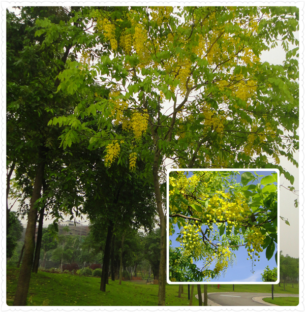 腊肠树又名黄金雨、金链花,为苏木科落叶乔木,是泰国国花。总状花序、疏散、下垂,花瓣黄色。盛花期满树金黄色花,花序随风摇曳、花瓣随风而如雨落,秋日果荚长垂如腊肠,故名腊肠树。