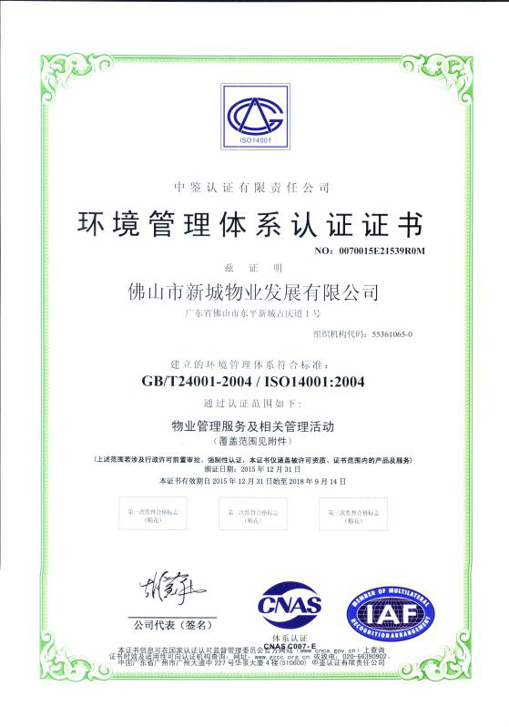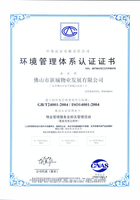 2015年12月25日,佛山市新城物业有限公司经广东中鉴认证有限责任公司审核批准,取得了ISO14001:2004环境管理体系认证证书和OHSAS18001:2007职业健康安全管理体系认证证书。此举标志着我司在标准化管理方面再次取得重大突破。