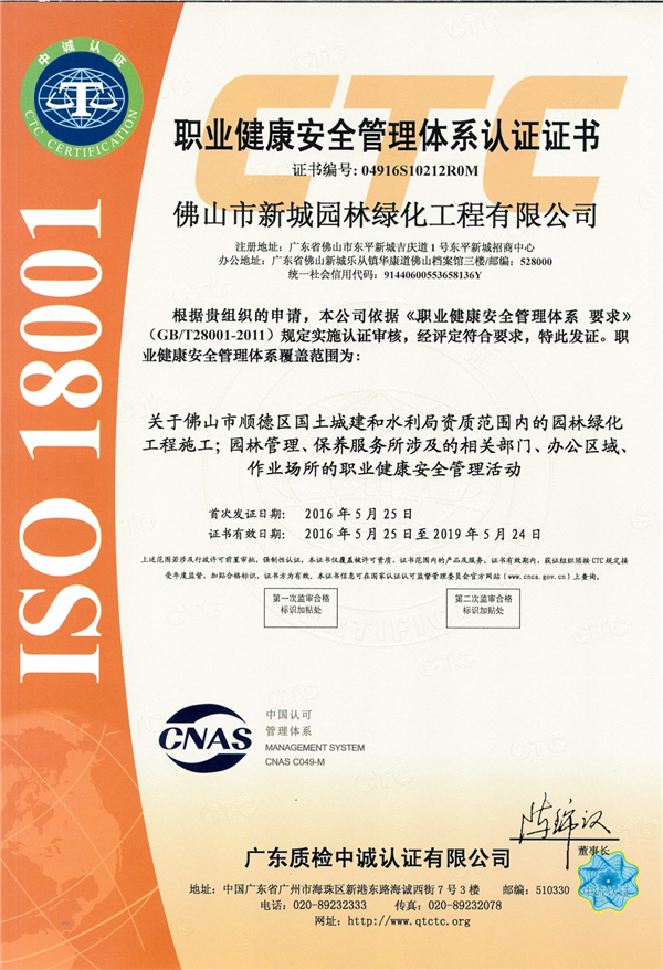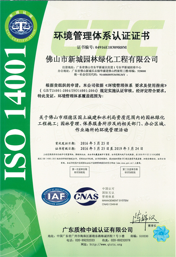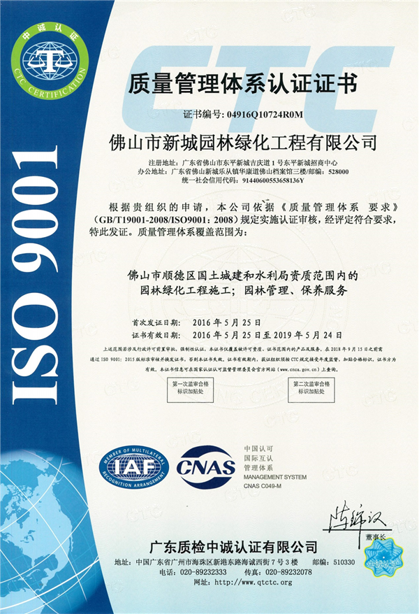 5月25日,新城绿化顺利通过了广东质检中诚认证有限公司(下称“中诚公司”)严格的外部审核,获取质量管理体系、职业健康安全管理体系及环境管理体系认证。 5月20日,中诚公司的专家团来到新城绿化,依据《质量管理体系要求》(ISO9001:2008)、《职业健康安全管理体系要求》(GB/T28001-2011)、《环境管理体系要求及使用指南》(ISO14001:2004)等相关规定实施认证审核,通过外部环境巡查、内部文件检查等审核环节,对我司的工程及管养质量、公司内部管理等情况进行了一次大检阅,并获得专家们的一致认可。 本次我司顺利通过ISO体系认证,是我司实现日常运作规范化、制度化、标准化的里程碑,对日后的长远发展起着积极的良性推动作用。(通讯员:余伟健)