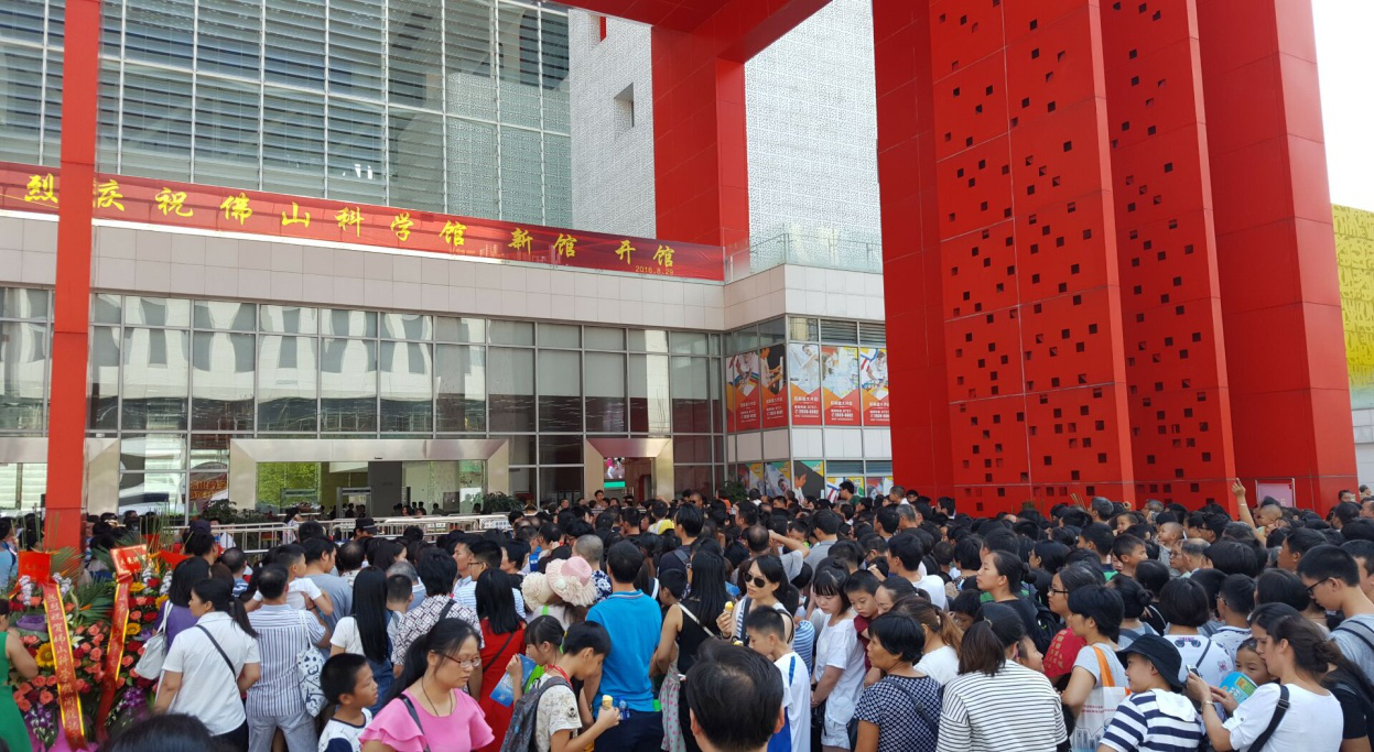 8月29日,佛山科学馆新馆正式对外开馆。消息一经传出,新兴的科学技术神秘魅力便吸引着大批市民前往参观。当天上午7:00开始,已陆续有市民在现场等候,截止至9:30,馆外已有上万市民排队等候入场,人数远超场馆预计容纳的4000人。