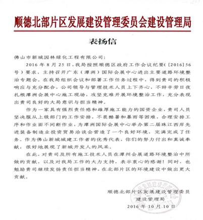为配合广东(潭洲)国际会展中心(下称“潭洲会展”)九月份的正式启用,新城绿化派出工作人员共计1500多人次赶赴施工前线,不辞劳苦、全力以赴奋战了60个日与夜、晴和雨,高质量完成了34万平方米的周边配套绿化工程。顺德北部片区发展建设管理委员建设管理局特此来信表扬了我司在潭洲会展中心环境整治工作中表现出了大局意识与担当精神,为潭洲会展举办第二届珠江西岸先进装备制造业投资贸易洽谈会营造了一个良好环境。
