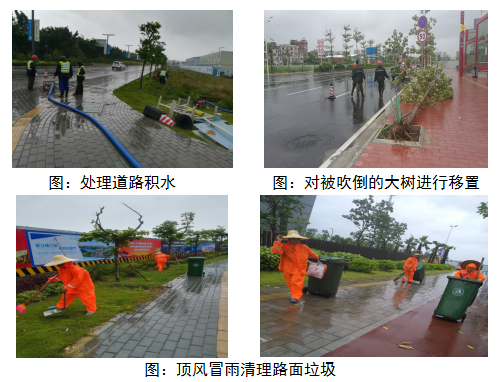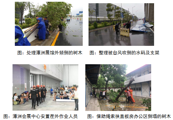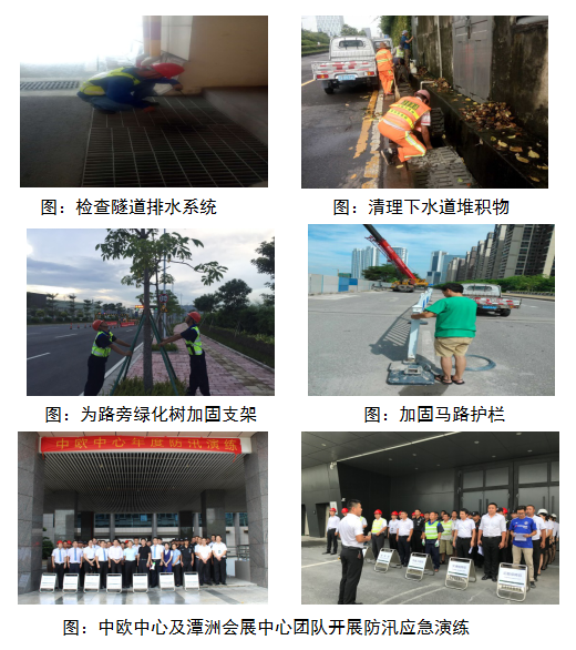 物业管理部应对工作方面,中欧中心物业管理处共出动人员约30人次,在漏水点堆垒沙袋,进行防渗漏等工作;文化中心物业管理处出动人员40余人次,疏通车辆900余车次,并排查天桥3座、工地围栏4处、易涝点8处,加固隔离画栏5处、使用沙包60余个,清理散落铁皮4块,协助清理倒树4棵,协助疏导游客1000余人;公园泳场物业管理处出动人员29人次,对园区各路段进行疏通、排险,防护各重要设施;潭洲国际会展中心团队出动人员268名,开展防台风工作,并安排所有工人、管理人员有序撤离至安全区域。
