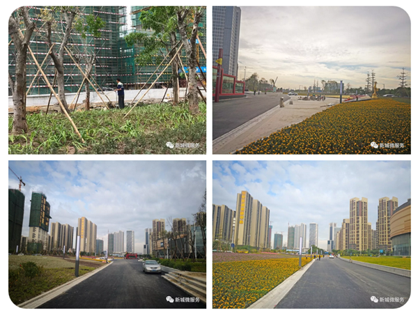 除了路网建设外,演艺中心周边绿化配套由新城绿化公司负责,为了在场馆周边营造最原汁原味的岭南水乡生态,在施工过程中坚持生态优先原则和适地适树原则,以种类丰富的植物,结合水体和绿地进行搭配。