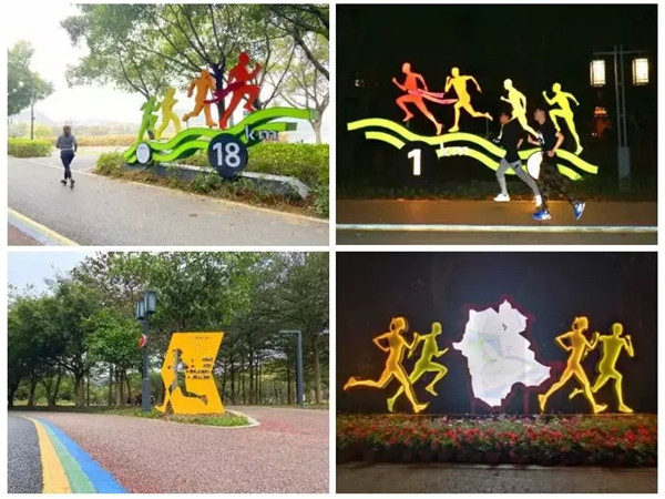 橙色系的雕塑小品,沿线配有橙黄色系的整公里数牌及黄色导视牌,体现运动、冲刺的热情。庭院灯灯柱上设有顺德城市形象LOGO灯箱,塑造城市新名片。