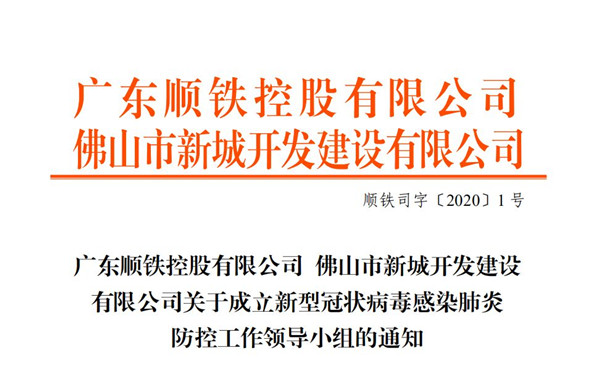 为进一步强化防控工作力度,集团公司成立了新型冠状病毒感染肺炎防控工作领导小组,并下设防疫工作办公室、管辖工程工地防控督导小组、物资保障及场所消杀组、督办组、宣传组等五个工作小组。此外,印发了《广东顺铁控股有限公司 佛山市新城开发建设有限公司关于新型冠状病毒感染的肺炎疫情防控及2020年春节后复工复产工作指引》,指导节后复工工作。