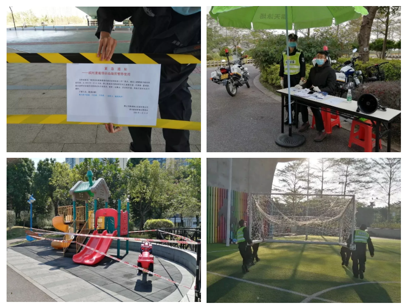 为避免人流聚集风险,经营板块派出工程人员对园区儿童、体育休闲设施等容易聚集人群比较多的场所进行围蔽,并张贴温馨提示。