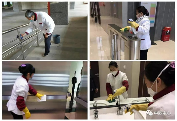专业保洁人员定时对园区内的洗手间、电梯、手扶梯等区域进行统一集中消毒。