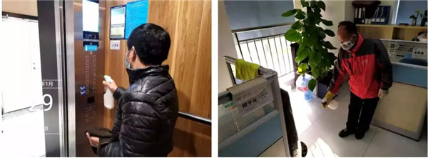 工作人员正为办公区域及电梯进行消毒。