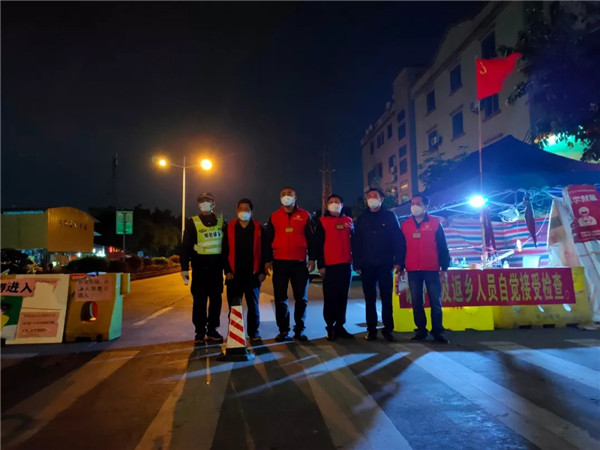 廖丰林(左四)与战友们深夜坚守一线。