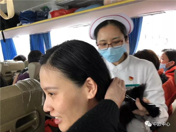 ▲出发前,王瑾妻子冯平平(左)毅然选择剪短自己的一头秀发。