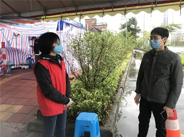 2月15日, 顺德区国资局副局长梁泳斌到一线看望、鼓励志愿者:“再大的风雨都不会动摇我们的意志,国资同志要继续发挥‘铁军’作用,维护一方平安。”并提醒一线志愿者们风雨中值守注意保暖防湿。