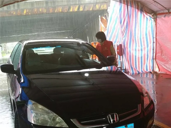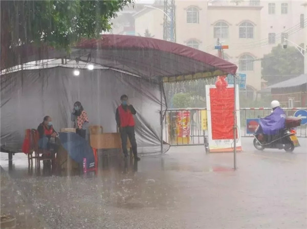 大雨瓢泼,志愿者仍坚守岗位。
