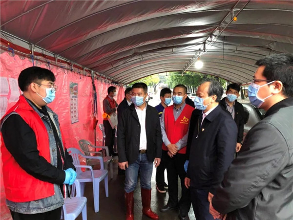 郭文海书记深入一线慰问抗疫人员,并与在岗值班志愿者进行交流。