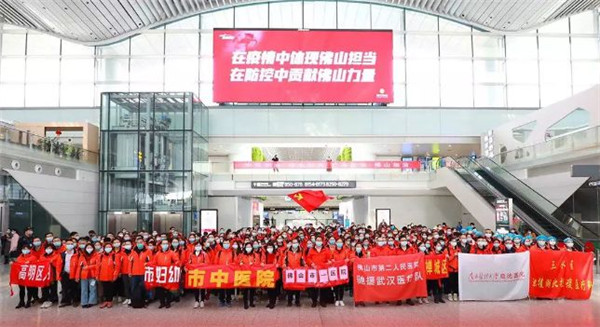 ▲2月13日,佛山市第四批驰援湖北的322名医务工作者在白云机场出发前合影。(图/佛山日报记者周春)