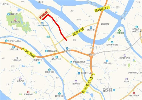 新均榄路(一期)将建设双向六车道,时速为60公里,道路建成将优化组团内凫洲河“一河两岸”的路网格局,改善均安组团的交通格局,缓解原有交通的狭窄、拥堵的局面。