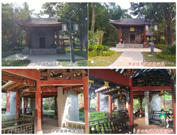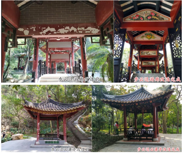 在顺德中心城区建设工程指挥部的统筹下,在顺德区国资局“一盘棋”的安排下,由广东顺德中心城区投资开发有限公司在顺峰山公园打造的又一仿古精品工程——顺峰山公园步云迳项目已于4月底完工,并于五一期间正式对外开放。该项目主要包括对现有连廊、茶室、倚云亭、云瀑亭进行改造提升,通过增设宫灯,增加彩绘等内容,打造特色游廊;通过叠砌黄蜡石,结合原有水塘修复给水系统和水溪,打造具有自然生态的石山瀑布;通过对绿化空间进行修缮调整,打通水系、增加花境,打造极具参与性的人文景观,为顺峰山公园添彩润色。
