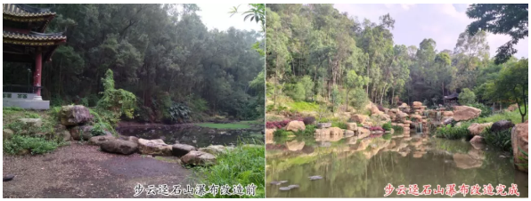 二、石山瀑布改造,把步云迳内原有水塘池底修补后,沿水池周边通过叠砌黄蜡石,修复原有给水系统和水溪,结合山石打造具有自然生态的石山瀑布,活化该区域的生态景观。