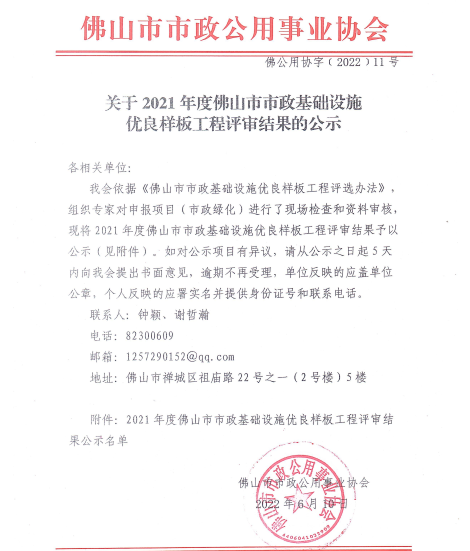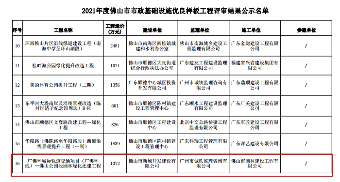 2021年度佛山市市政基础设施优良样板工程评审结果公示阶段