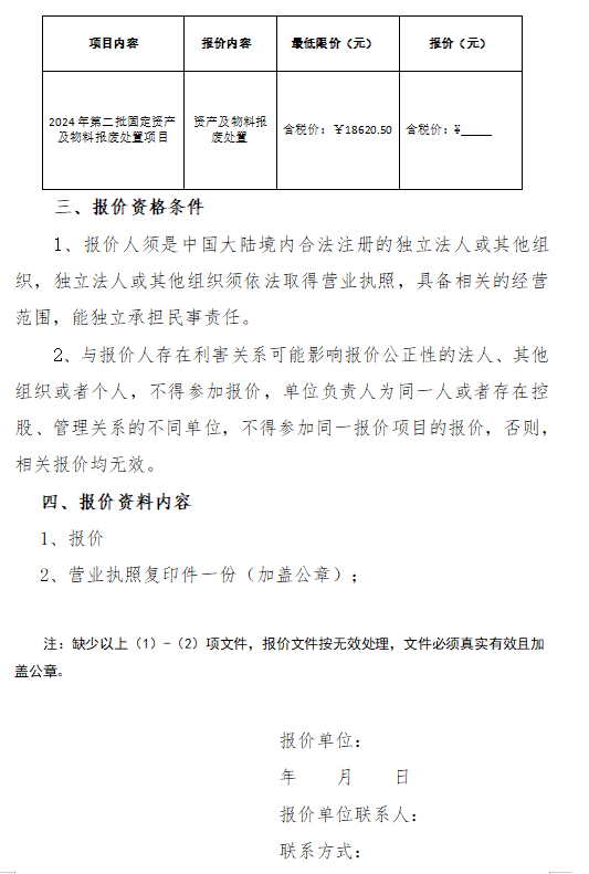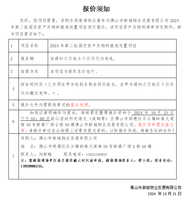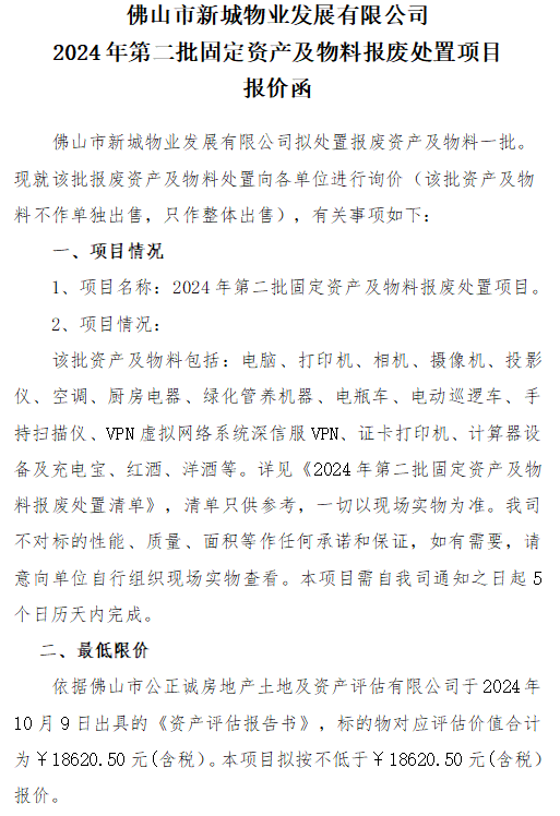 佛山市新城物业发展有限公司2024年第二批固定资产及物料报废处置项目报价函