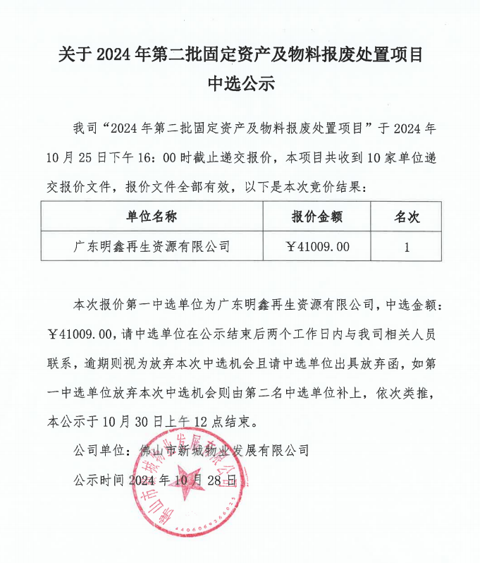 关于2024年第二批固定资产及物料报废处置项目中选公示