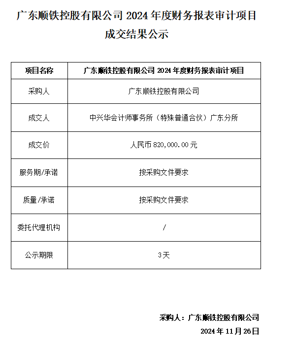 广东顺铁控股有限公司2024年度财务报表审计项目成交结果公示