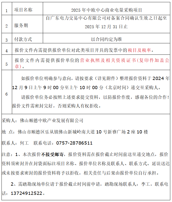 您好,因项目需要,采购方拟对2025年中欧中心商业电量采购项目进行询价,欢迎符合条件的供应商参与报价,该项目清单详见附件。相关项目要求如下: