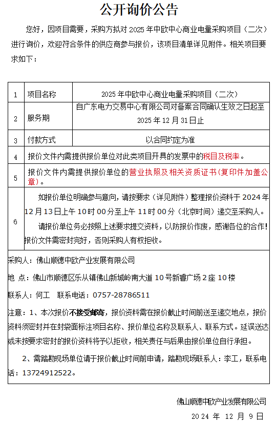 2025年中欧中心商业电量采购项目(二次)公开询价公告