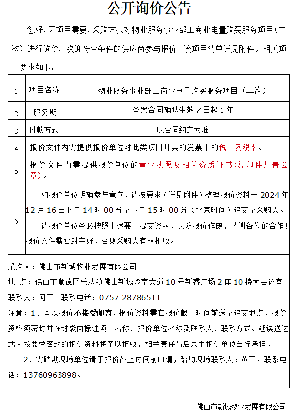 物业服务事业部工商业电量购买服务项目(二次)公开询价公告