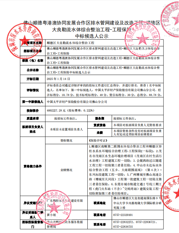 佛山顺德粤港澳协同发展合作区排水管网建设及改造工程-顺德区大良勒流水体综合整治工程-工程保险中标候选人公示
