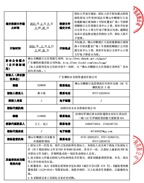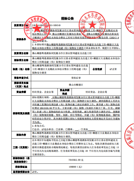 佛山顺德粤港澳协同发展合作区排水管网建设及改造工程-顺德区大良勒流水体综合整治工程周边建(构)筑物安全调查招标公告