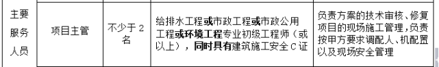 更改为:评审办法5.1 技术部分评审标准 拟派项目团队 (2)项目主管:配备2名,且具有给排水工程或市政工程或市政公用工程或环境工程专业初级工程师(或以上),同时具有建筑施工安全C证或建筑施工安全B证;