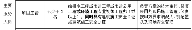 2.原采购文件第五章 评审办法5.1 技术部分评审标准 拟派项目团队 (2)项目主管:配备2名,且具有给排水工程或市政工程或市政公用工程或环境工程专业初级工程师(或以上),同时具有建筑施工安全C证;