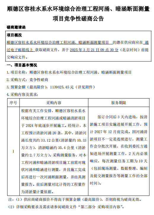 顺德区容桂水系水环境综合治理工程河涌、暗涵断面测量项目竞争性磋商公告
