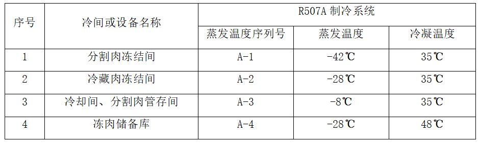 A-3系统:蒸发温度为-8℃,冷凝温度为35℃,设计所需机械负荷为510kW,制冷机采用R507A不等匹五并联全自动活塞制冷压缩机组。(3层冷却间+3层分割肉暂存间)