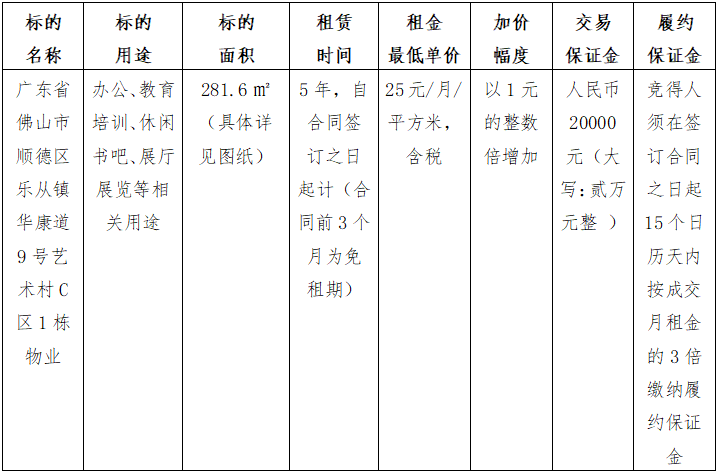 佛山市新城物业发展有限公司采用公开招租方式出租位于广东省佛山市顺德区乐从镇华康道9号艺术村C区1栋物业使用权,欢迎符合资格的竞租人前来报价。