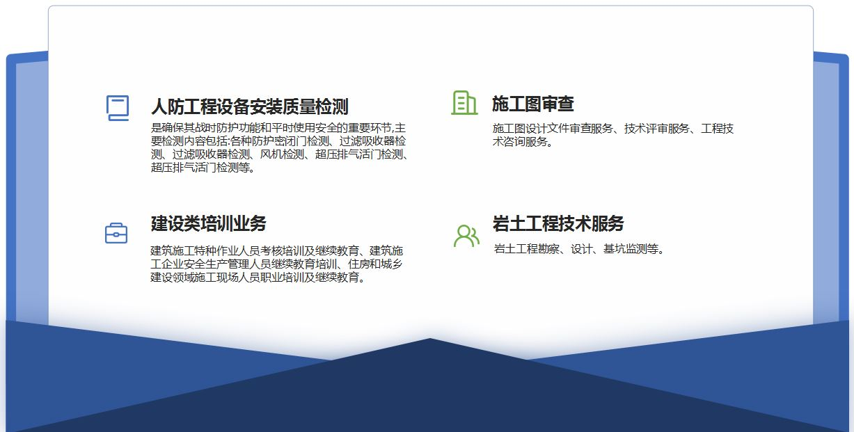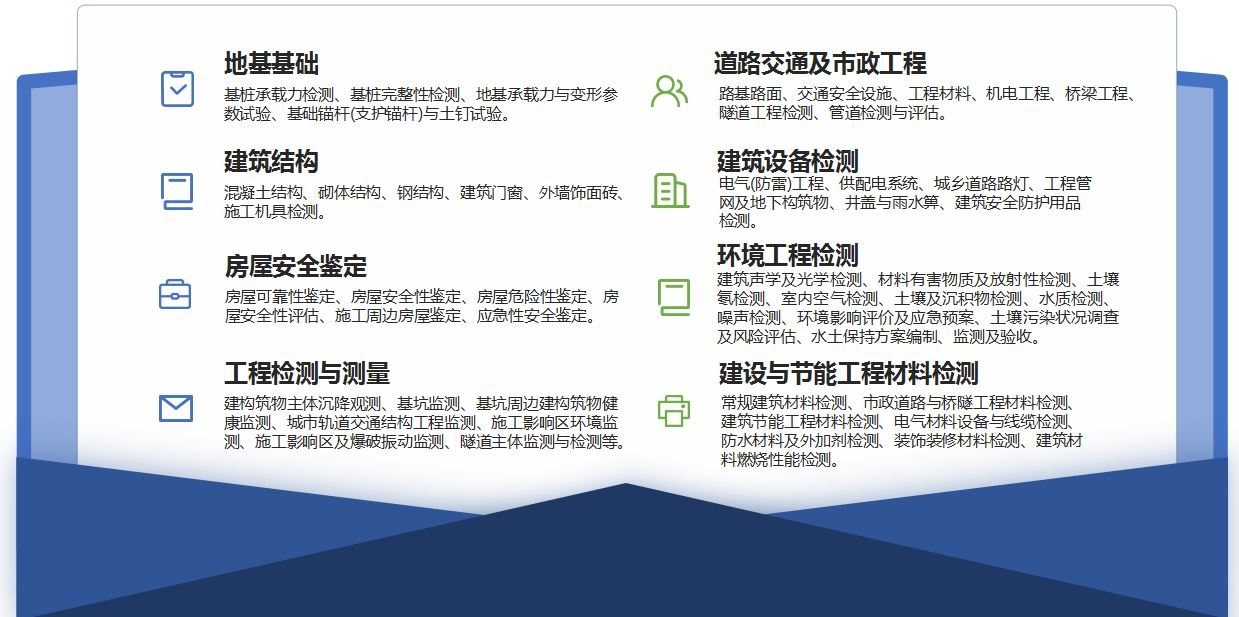 业务范围涵盖地基基础、道路交通及市政工程、建筑结构、建筑设备检测、房屋安全鉴定、环境工程检测、工程检测与测量、建设与节能工程材料检测、人防工程设备安全质量检测、施工图审查、建设类培训业务、岩土工程技术服务等。