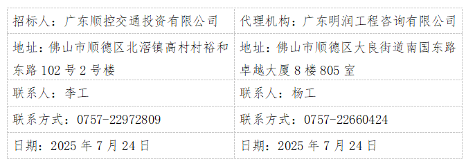 顺德区2025~2027年度公路桥梁隧道定期检查及桥梁监测项目(项目编号:GDMR20250715-01)于2025年7月15日在佛山市顺德区公共资源交易中心网、顺德区国有资产监督管理局网站、广东顺铁控股有限公司佛山市新城开发建设有限公司网站、优盟平台、广东明润工程咨询有限公司网站发布招标公告,因本项目规模发生重大调整,现终止本项目招标投标活动,由此给各投标人工作造成的不便,敬请谅解。