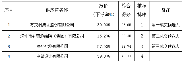 本项目按磋商文件约定,根据磋商小组出具的《评审报告》,最终磋商小组根据磋商文件规定推荐3名成交候选人,推荐3名成交候选人如下,推荐 苏交科集团股份有限公司 为第一成交候选人,成交下浮率为 30.00 %;推荐 深圳市勘察测绘院(集团)有限公司 为第二成交候选人,成交下浮率为 15.29 %;推荐 建勘勘测有限公司 为第三成交候选人,成交下浮率为 57.00%。
