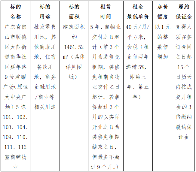 1.项目名称:大良君耀广场(原恒大中央广场)部分商铺物业公开招租
