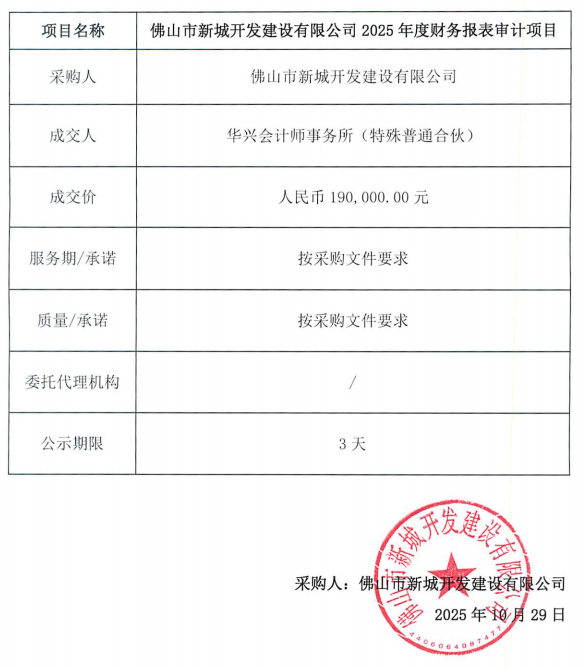 佛山市新城开发建设有限公司2025年度财务报表审计项目成交结果公示