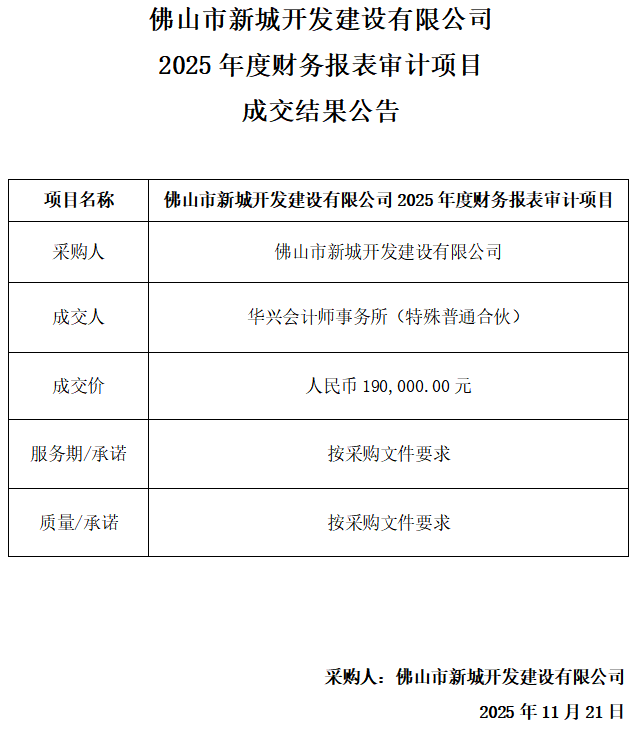 佛山市新城开发建设有限公司2025年度财务报表审计项目成交结果公告