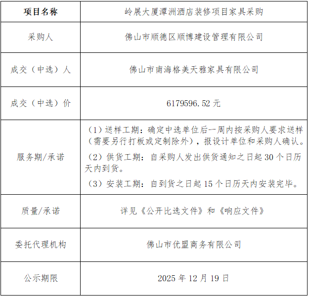 岭展大厦潭洲酒店装修项目家具采购 成交(中选)结果公示
